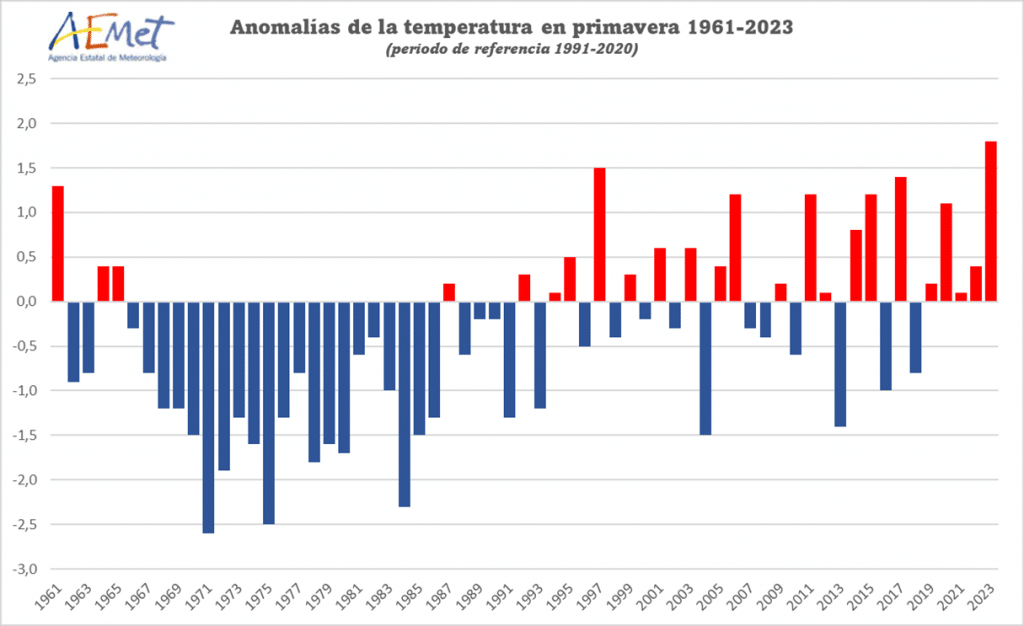 La Agencia Estatal de Meteorología (AEMET), dependiente del Ministerio para la Transición Ecológica y el Reto Demográfico (MITECO), ha hecho público su balance de la primavera de 2023, que se trató de la más cálida de la serie histórica, cuyo arranque data de 1961.