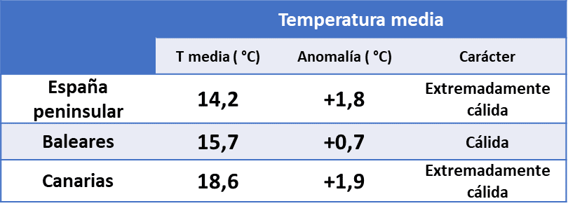 Los meses de marzo y abril fueron muy cálidos: marzo fue el tercero más cálido de la serie, mientras que abril fue el más cálido, con una temperatura media superior en 3ºC al promedio normal y con un importante episodio de altas temperaturas a finales de mes: entre los días 25 y 29, todas las jornadas fueron las más cálidas para esas fechas desde, al menos, 1950.