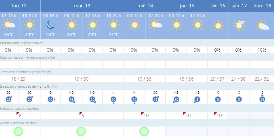 En esta semana del 12 al 18, mediados de junio, se disparan las temperaturas llegando hasta los 38 grados centígrados en el fin de semana y desaparecen totalmente las lluvias en Sevilla, según informa la Agencia Estatal de Meteorología (AEMET).