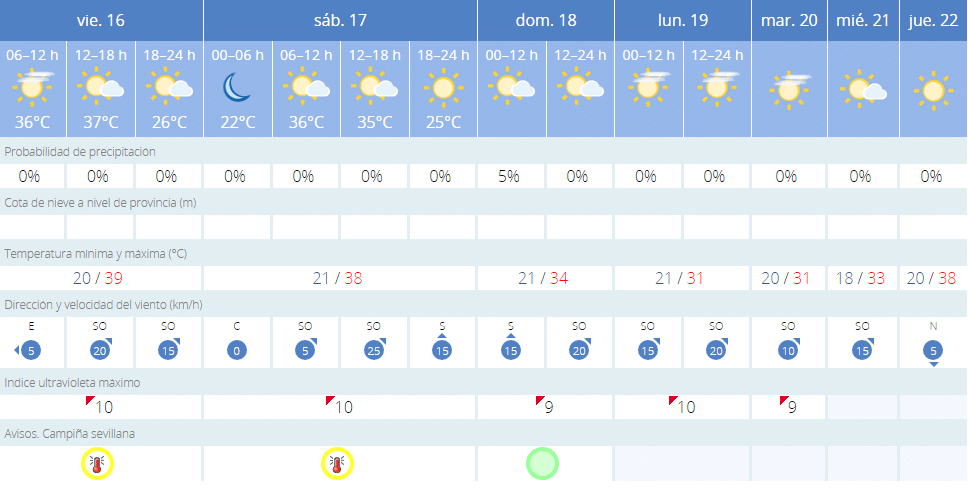 La alerta amarilla continuará el sábado 17 de junio con máximas de 38 grados centígrados y mínimas de 21. Al igual que el viernes, las temperaturas no bajarán hasta bien entrada la tarde. El domingo se producirá un pronunciado descenso de las máximas que dará un respiro a los sevillanos. Las máximas serán de 34 grados y las mínimas serán de 21.