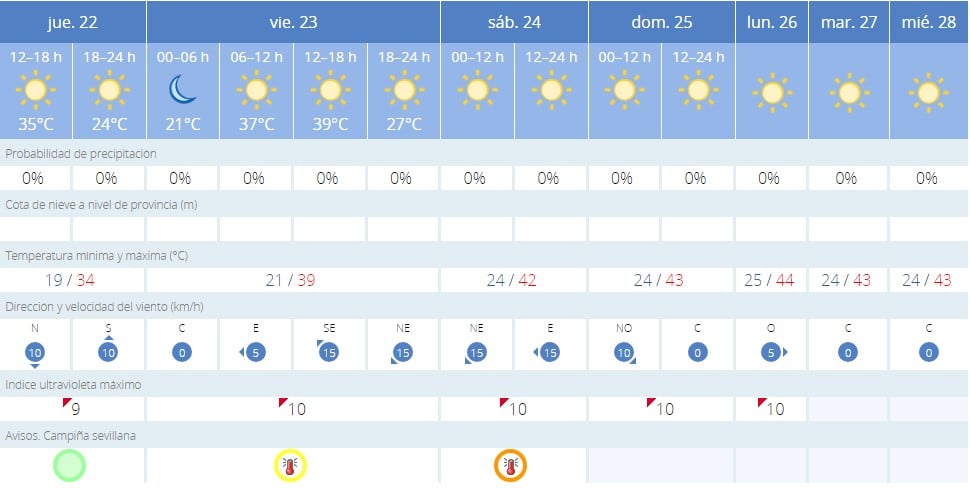El sábado subirán las temperaturas y los termómetros llegarán a marcar hasta los 42ºC, acompañados de un aviso naranja de la Agencia Estatal de Meteorología. De cara al domingo 25, el calor extremo seguirá apretando en Sevilla, donde se esperan máximas de 43 grados. Una tónica al alza que se seguirá sucediendo a lo largo de la próxima semana, donde se llegará incluso a las 44ºC el lunes.