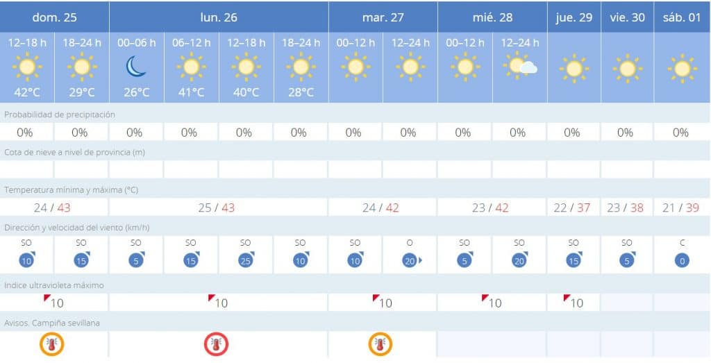 El lunes se sufrirá un aumento de las temperaturas más fuerte, siendo el día de mayor calor en Sevilla, donde se podrán alcanzar los 43ºC. Será a partir del jueves 29 cuando se inicie un descenso ligero y progresivo de las temperaturas, aunque se seguirán siendo elevadas.