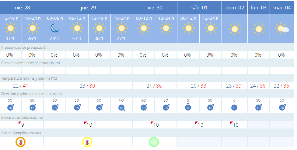 La ola de calor sigue azotando a la ciudad de Sevilla desde el pasado fin de semana. La AEMET activó el aviso rojo por temperaturas de hasta 44ºC y, este miércoles, sigue vigente el aviso naranja por máximas de 41 grados en la capital hispalense. Sin embargo, parece que el calor dará una tregua a los sevillanos este jueves, y de cara al fin de semana, donde se esperan temperaturas por debajo de los 40ºC.