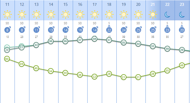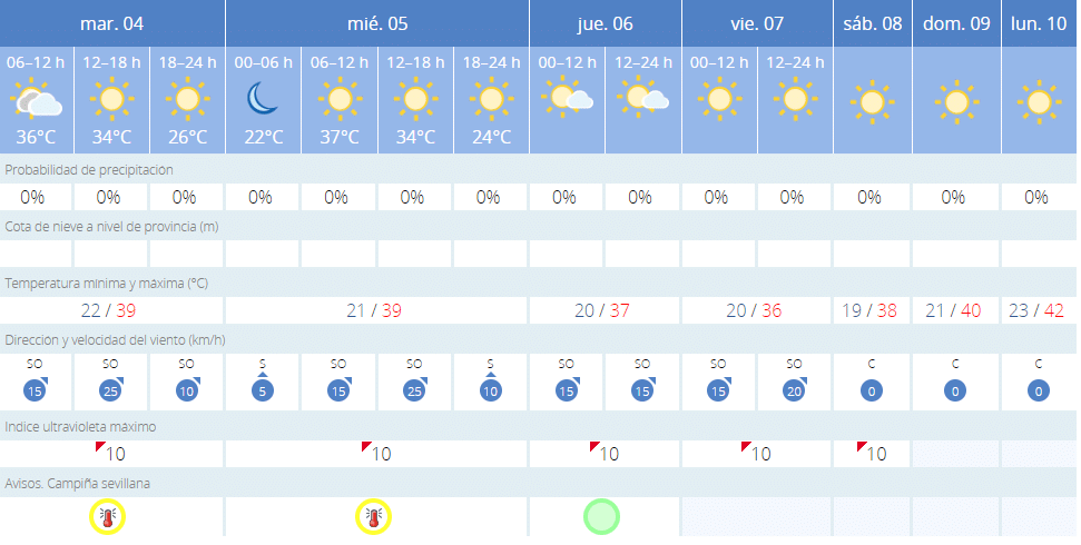 Las previsiones meteorológicas de AEMET para el resto de la semana, a su vez, auguran que se extienda el aviso amarillo por calor en Sevilla hasta el miércoles, donde también habrá máximas de cerca de 40 grados concentradas entre el mediodía y el inicio de la tarde.