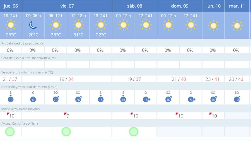 La AEMET lleva previendo esta segunda ola de calor desde el fin de semana pasado, aunque cuanto más se acerquen las fechas, más seguros y fiables serán los pronósticos. El pasado sábado 1 de julio, la Agencia lanzó una preocupante predicción para este fin de semana, que sostenía que se podrían alcanzar máximos históricos en la capital hispalense, con temperaturas cercanas a los 47 Cº. Por suerte, con el avance de los días los pronósticos se hicieron menos alarmantes, aunque 44 Cº sigue siendo una temperatura muy elevada.