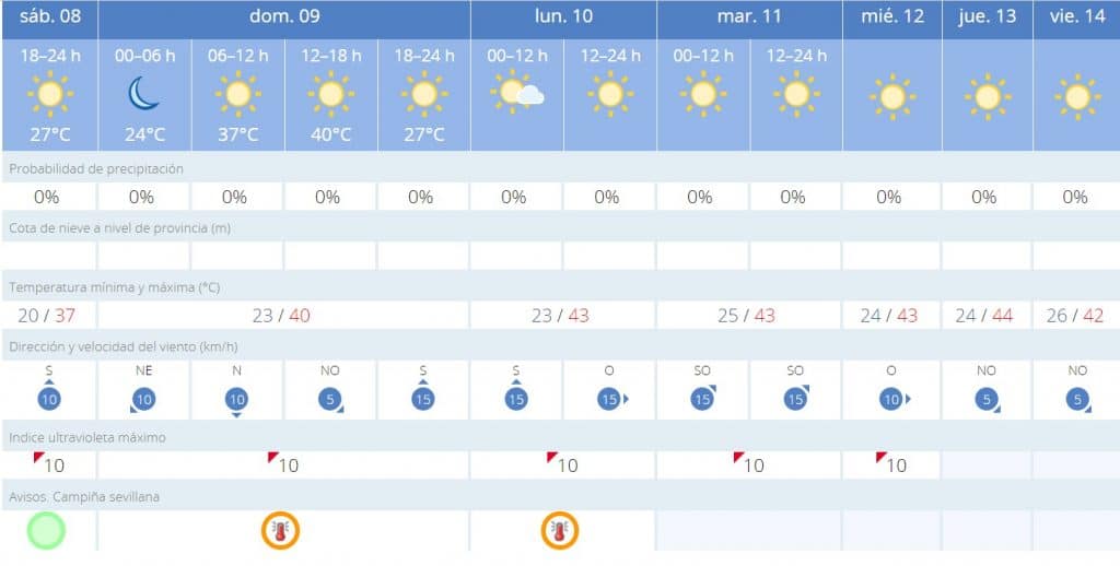 En cuanto a las mínimas, tampoco bajarán de lo 20ºC y se espera que su máxima sea el viernes 14 de julio, con 26 grados. Para este domingo se prevén 40ºC de máxima, que subirán hasta los 43 el lunes y se mantendrán hasta el jueves, el día con la máxima más alta, 44ºC.