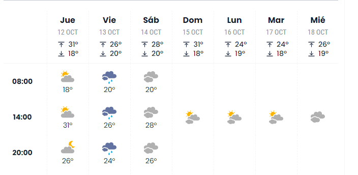 Así, el próximo jueves, 12 de octubre, se esperan máximas de 31ºC y mínimas de 18, con cielos nublados y como antesala de una jornada que estará marcada por la lluvia. Durante el viernes 13 continuarán bajando las temperaturas, que se situarán en los 26ºC, casi diez menos que esta semana. Además, habrá una probabilidad de lluvia del 80% y de tormenta del 20% en la capital. El fin de semana, por su parte, seguirá con temperaturas suaves, si bien remontarán hasta los 31ºC el domingo, para volver a descender hasta los 24 al comienzo de la semana.