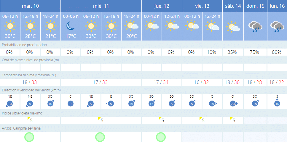 El viernes 13, las máximas disminuirán hasta los 32 grados y las mínimas hasta los 16. El sábado 14 las máximas serán de 30 grados y las mínimas de 18. Este día las probabilidades de precipitaciones serán de un 35%. El domingo se producirá otra bajada de las temperaturas en Sevilla, siendo las máximas de 28 grados, y las probabilidades de lluvias serán de un 75%. La semana que viene comenzará pasada por agua, con un lunes que dejará máximas de 22 grados y probabilidades de precipitaciones de un 80%.