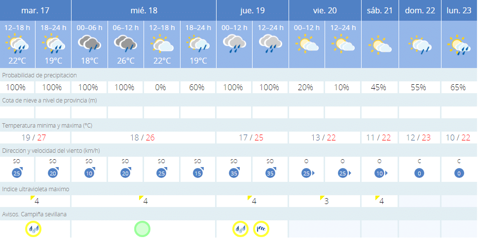 Sevilla ha entrado este martes en aviso amarillo por riesgo de lluvia, tal y como ha precisado la Agencia Estatal de Meteorología a través del servicio de Emergencias 112 Andalucía. Este aviso, que se había dado tan solo en algunas provincias, se ha extendido en la tarde de este martes a la provincia. Así, se espera también otro aviso amarillo el jueves, también por lluvia y, además, por viento.