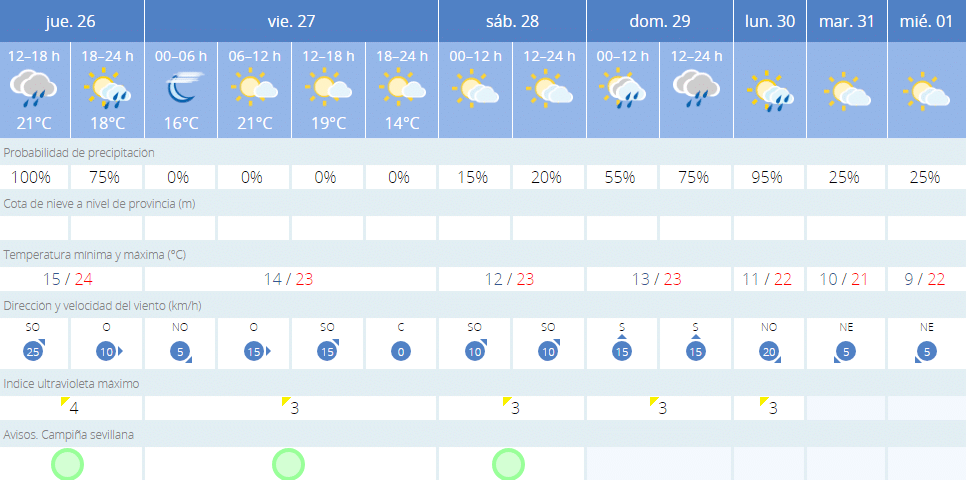 Para este viernes se esperan cielos casi despejados, cero probabilidad de precipitaciones y máximas que vuelven a superar los 20 grados. El sábado las nubes estarán más presentes y la probabilidad de lluvia subirá hasta el 20%, a pesar de que no se espera la llegada de ningún frente. Las temperaturas se mantendrán estables, muy parecidas a las de la jornada anterior. Ya el domingo la lluvia podrá caer en Sevilla con un 75% de probabilidad, dando inicio a dos días seguidos de precipitaciones.