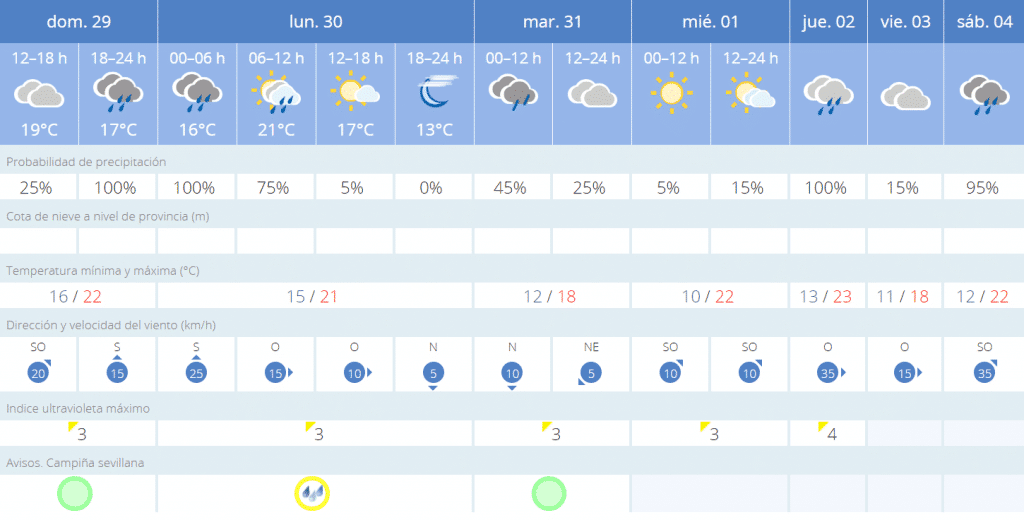 En cuanto a las temperaturas, las máximas se moverán en una horquilla entre los 18 y los 22 grados; las mínimas, por su parte, lo harán entre los 10 y los 16 grados. El lunes comenzará la semana con un aviso amarillo por fuertes lluvias en Sevilla, donde la probabilidad de precipitación será del 100% entre las 0:00 y las 6:00 horas, y del 75% entre las 6:00 y las 12:00 horas. A partir del medio día la probabilidad bajará hasta el 5%.