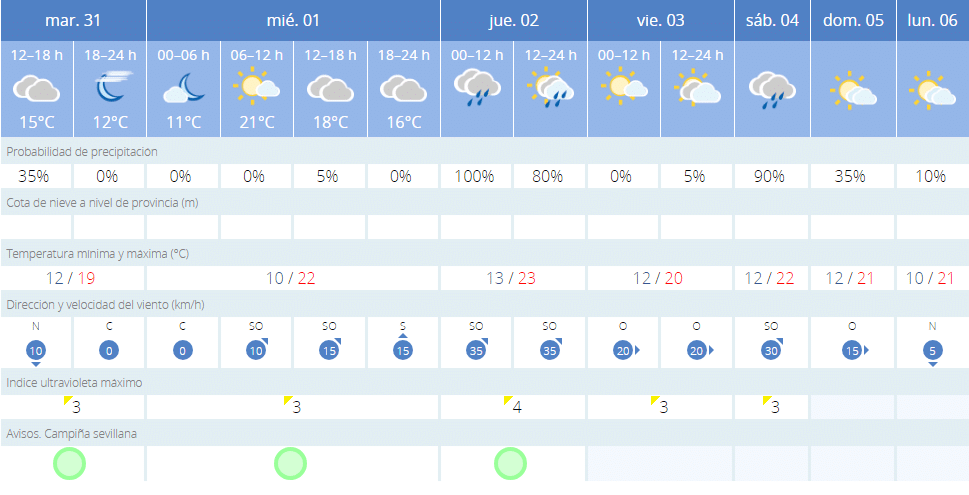 La lluvia tendrá una presencia intermitente en Sevilla durante este fin de semana. Según pronostica la Agencia Estatal de Meteorología (Aemet), para este martes 31 de octubre, último día del mes, las probabilidades serán de prácticamente nulas a pesar de los nubosos cielos.