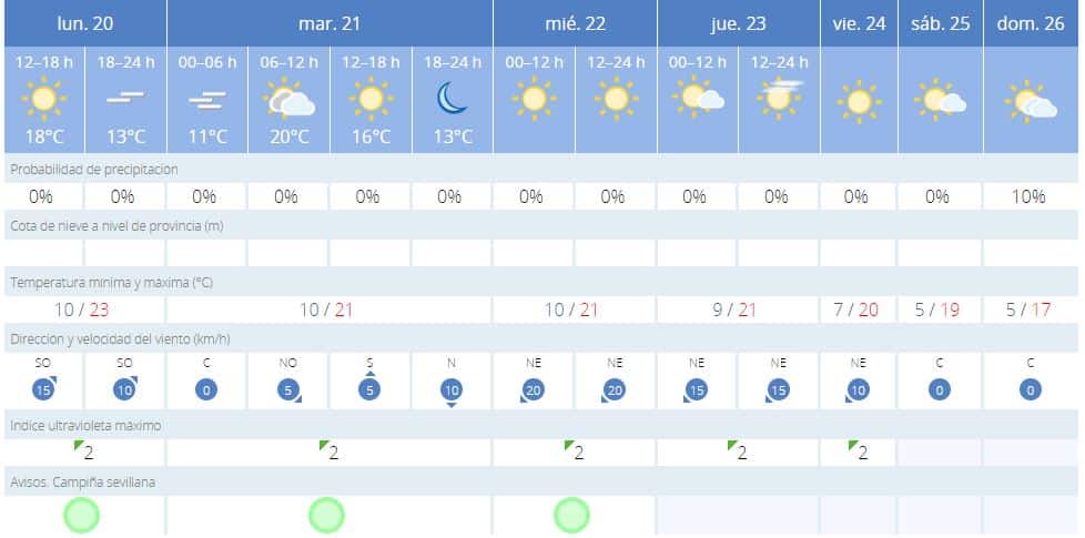 Durante esta penúltima semana de noviembre, Sevilla pasará por un periodo de bajada de temperaturas que, aunque leve, colocará los termómetros en los 17 grados de máxima el domingo. Tras varias semanas de clima leve y días soleados, por fin empieza a acercarse el clima invernal a la capital hispalense.