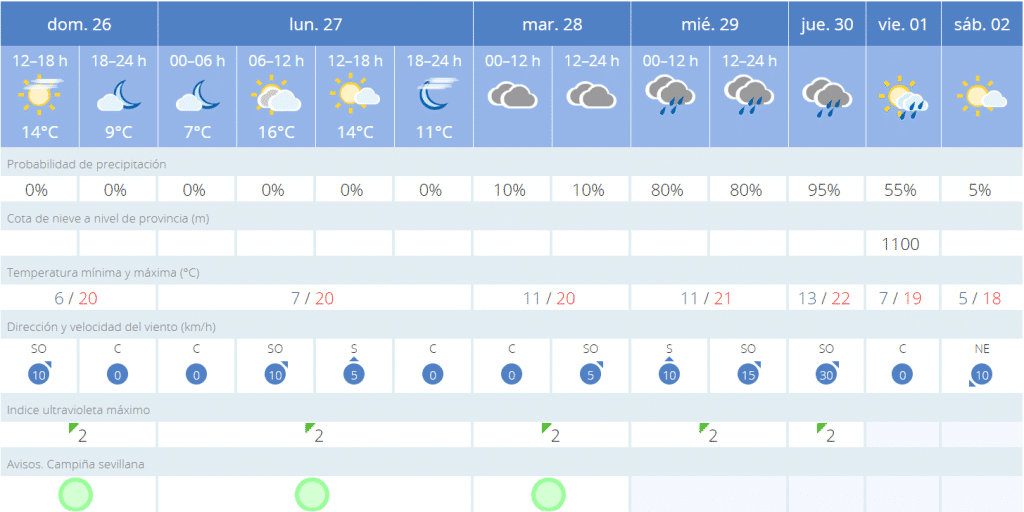 La lluvia vuelve a Sevilla en una semana donde la subida de las temperaturas volverá a caldear el ambiente en la capital, según los datos de la AEMET. Las mínimas subirán paulatinamente desde los seis hasta los 13 grados, y las máximas volverán a pasar de los 20, situándose en los 22ºC a mitad de semana. Se esperan precipitaciones a partir del martes y hasta el viernes, con una probabilidad de hasta el 95%.