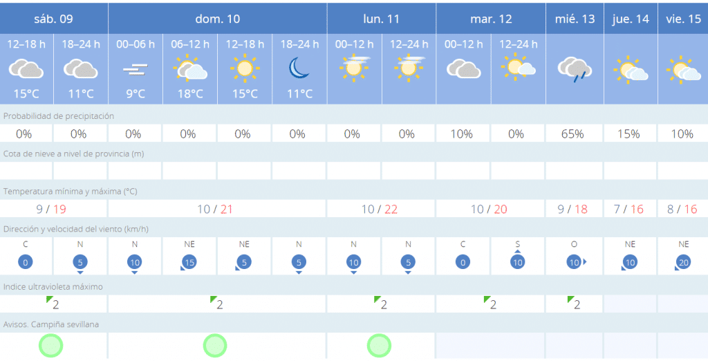 El martes Sevilla se nublará, pero los termómetros seguirán marcando los 20 grados de máxima y los diez de mínima. Además, aparecerá una pequeña probabilidad de lluvia del 10%. Esta subirá hasta el 65% el miércoles, donde se esperan precipitaciones y las temperaturas descienden hasta los 18 grados.