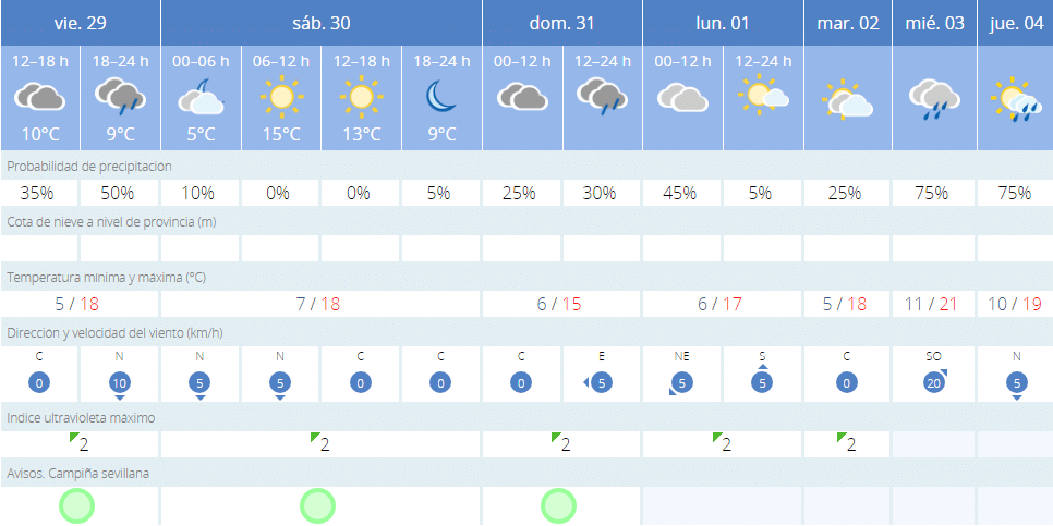 Según la AEMET, el año empezará con cielos nublados pero sin apenas porcentaje de lluvia en Sevilla. Así, el 1 de enero, hay una probabilidad del 45%; del 25% si nos centramos en el martes 2 de enero; y del 75% los días 3 y 4 del mismo mes.