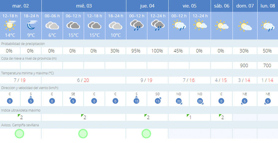 El jueves 4, día en que el Heraldo Real sale a las calles de Sevilla a recoger las cartas de los niños, si habrá lluvia y parece que de manera abundante. Las probabilidades de precipitaciones llegarán a ser de un 100%. Con respecto a las temperaturas, estas oscilarán entre los nueve grados de mínimas y los 19 de máxima.