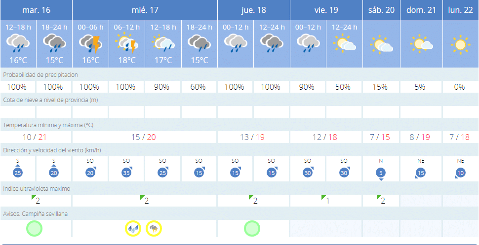 El jueves 18 no se espera la presencia de tormentas pero las probabilidades de precipitaciones será de un 100% a lo largo de todo el día. El viernes 19 se empezará a notar el abandono de la lluvia en Sevilla. Ya se podrá ver el sol entre las nubes y las probabilidades de precipitaciones bajarán hasta un 50%.
