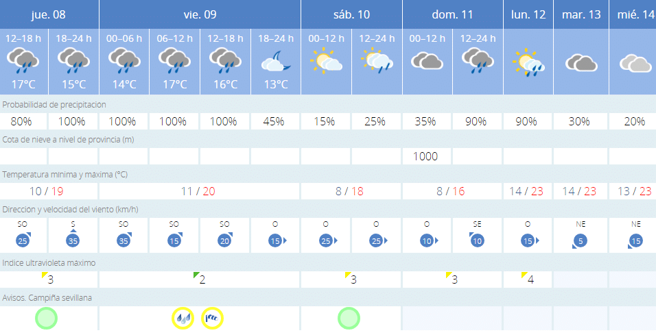 Para el sábado, la lluvia aparecerá en Sevilla con un 25% de probabilidad como máximo, estando los cielos más despejados que en la jornada anterior. Ya el domingo volverá a subir la probabilidad de precipitaciones hasta el 90%, aunque sin avisos por el momento.