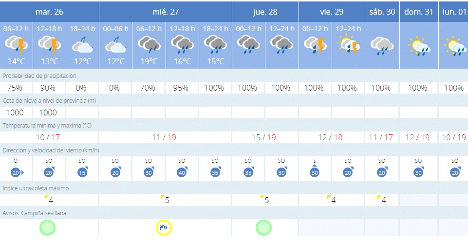 El tiempo hasta el final de la Semana Santa continuará inestable. En la jornada del Miércoles Santo la lluvia también hará acto de presencia con un 100% de probabilidad en las últimas horas de la tarde. La AEMET ha lanzado un aviso amarillo por viento para esta jornada.