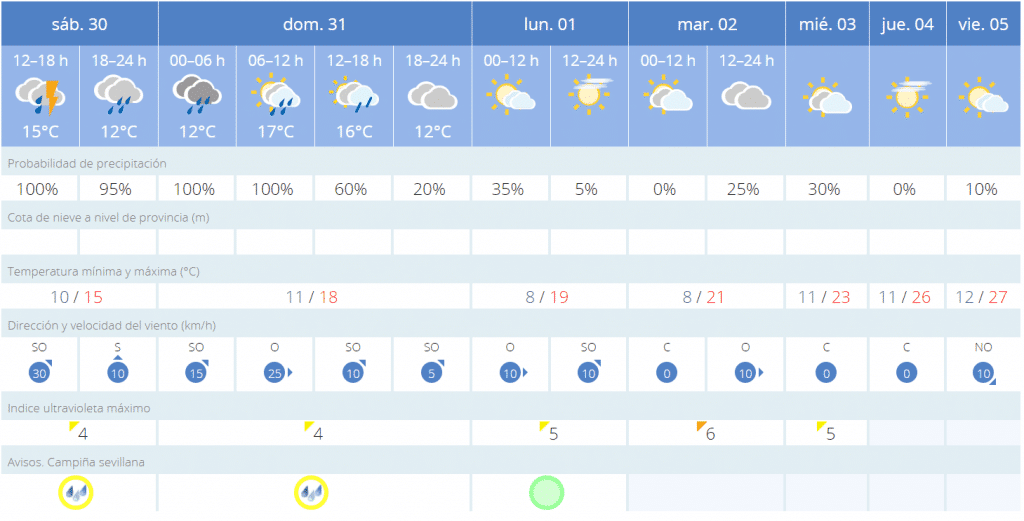 La Agencia Estatal de Meteorología ha lanzado un aviso amarillo por precipitaciones para este sábado y este domingo, donde la probabilidad de lluvia es del 100%. La jornada del domingo podría ser la última en la que se vieran lluvias, ya que a partir de las 18:00 horas se reduce esta posibilidad al 20%.