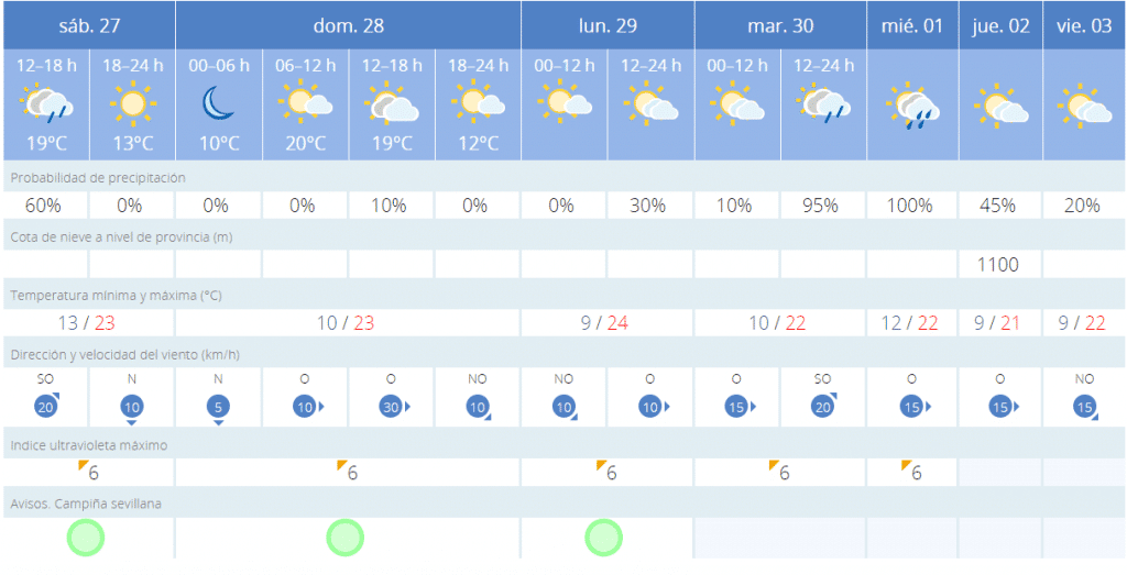 El miércoles 1 de mayo será el día que más llueva de toda la semana en Sevilla, habiendo un 100% de probabilidades de precipitaciones. Las temperaturas serán de doce grados en las mínimas y 22 en las máximas.