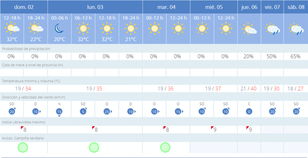 El jueves 6 de junio será el día más caluroso de la semana en Sevilla, alcanzando las máximas los 40 grados centígrados. Las mínimas también ascenderán hasta los 21 grados. Los cielos estarán parcialmente despejados y habrá un 20% de que se produzcan chubascos.