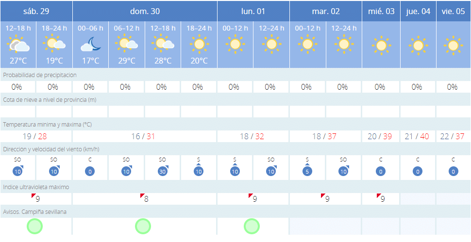 La tónica será similar el martes y el miércoles, día 2 y 3 respectivamente. Será el jueves 4 de julio cuando los termómetros de Sevilla marcarán los 40 grados centígrados. Por otro lado, las mínimas ese día serán de 21 grados centígrados.