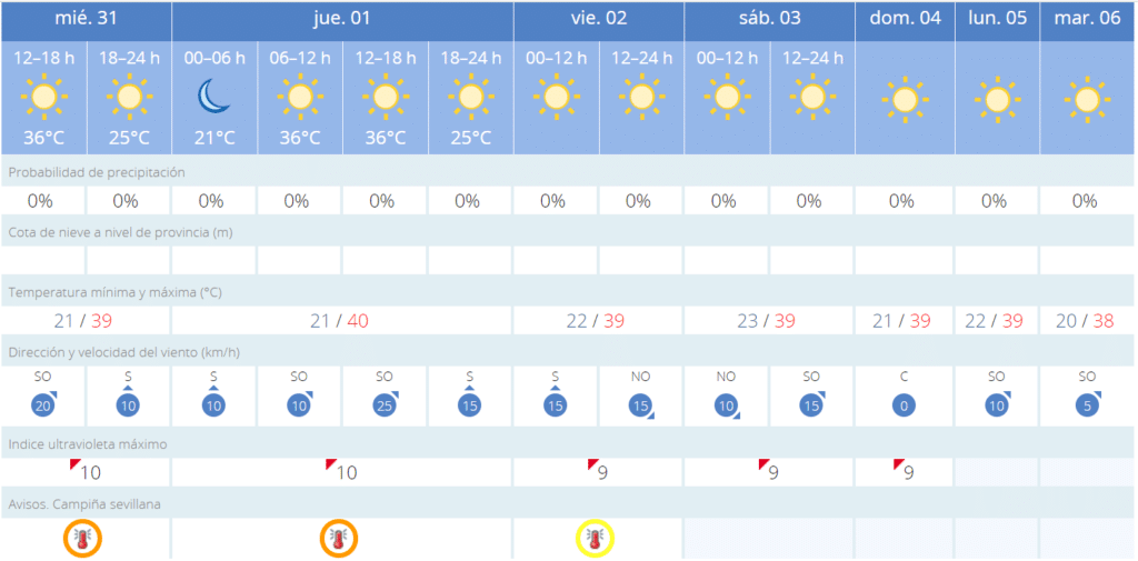 El miércoles las temperaturas máximas llegarán a 39 grados, activando la alerta naranja por parte de la Agencia Estatal de Meteorología (Aemet). El jueves será el día más caluroso de la semana, con temperaturas que alcanzarán los 40 grados. El viernes la alerta bajará a amarilla, con máximas de 39 grados. Las noches serán cálidas pero tolerables, con temperaturas mínimas entre 20 y 22 grados, excepto la madrugada del sábado, cuando no se bajará de los 23 grados, dificultando el sueño sin ventilador o aire acondicionado.