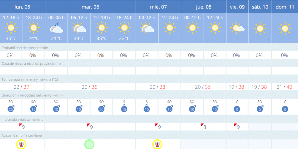 Las temperaturas darán un respiro y bajarán de forma generalizada en Sevilla durante la primera mitad de la semana con máximas que oscilarán entre los 36 y 40 grados. Sin embargo empezarán a subir a partir de la segunda mitad hasta alcanzar los 40 de forma puntual en zonas del interior de la provincia. A pesar de ser temperaturas elevadas para esta época del año, «no serán suficientes» para activar una nueva ola de calor en la comunidad.