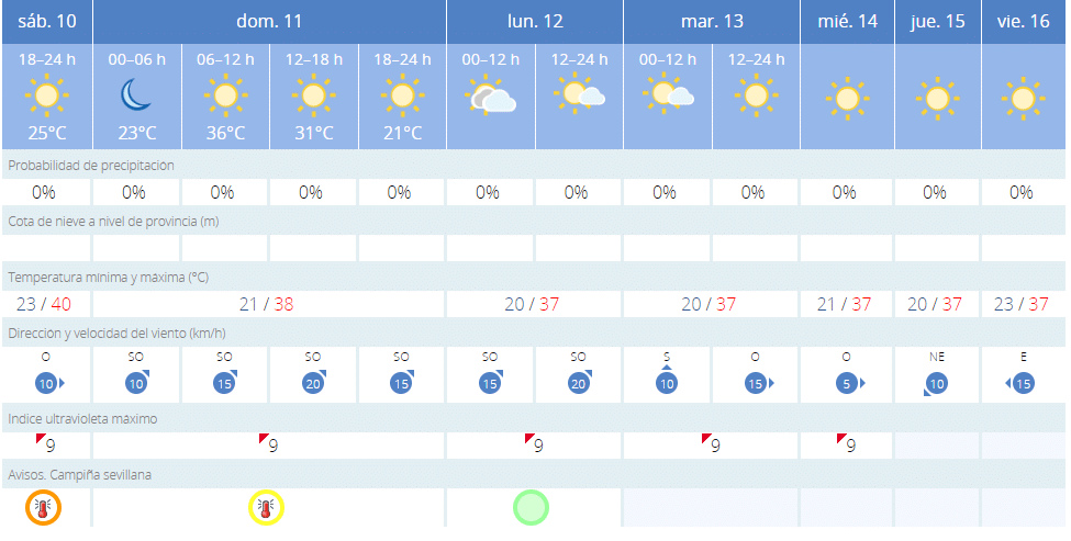 Según el pronóstico de la Aemet, las temperaturas máximas no descenderán de los 37 grados centígrados. Por otro lado, las mínimas oscilarán entre los 20 y los 23 grados. Los cielos estarán completamente despejados y las probabilidades de precipitaciones serán de un 0%.