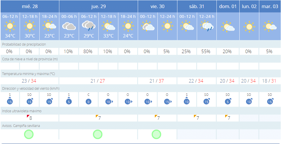 Las probabilidades de lluvia para esta semana aumentan en Sevilla. En concreto, según informa la Agencia Estatal de Meteorología (Aemet) para este jueves 29 de agosto el porcentaje ha pasado de un 50% a un 80%.