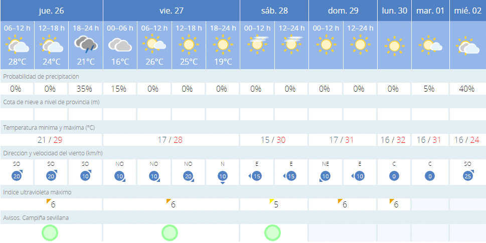 Será con el comienzo de octubre en Sevilla cuando las temperaturas se desplomen. Se pasará de 31 grados de máxima que habrá el martes 1 a 24 grados centígrados de máxima del miércoles día 2 de octubre.
