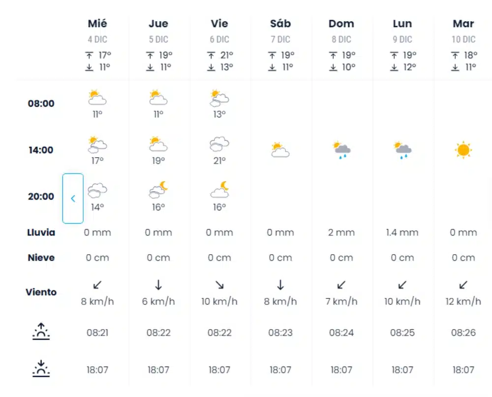 Según la web meteorológica de eltiempo.es, que realiza predicciones a 14 días vista, el próximo día 8 de diciembre lloverá en Sevilla. No serán, no obstante, fuertes precipitaciones, si bien se esperan, por el momento, dos litros por metro cuadrado. Eso sí, el día anterior, el 7 de diciembre, durante los traslados a la Seo hispalense, no habrá atisbo de lluvia, según también esta web.