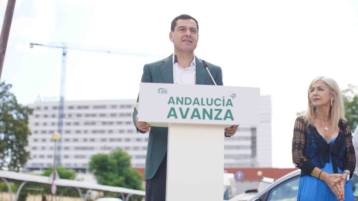 El presidente del PP de Andalucía y candidato a la reelección como presidente de la Junta de Andalucía, Juanma Moreno, atiende a los medios de comunicación. En la Avda. Rodríguez de Casso, esquina Avda. de Pizarro (dentro del Parque de María Luisa, entrando por la Glorieta de los Marineros).