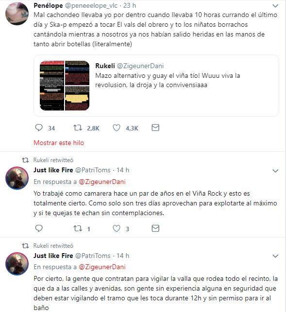 Todo ello es tan solo la versión de un trabajador del Viña, parte del Staff y camarero. Sin embargo, su denuncia ha sido trasladada a Twitter y ya ha tenido más de 8.000 retuits. Entre el más de un centenar de respuestas que hay hasta el momento en la publicación se encuentran testimonios de otros trabajadores que dan fe de lo que narra el usuario. «Un día trabajé 17 horas», comparte uno. «100% real», afirma otro, «son unos explotadores». Uno más añade otra denuncia parecida, esta vez sobre la vigilancia exterior del recinto: «son gente sin experiencia alguna en seguridad que deben estar vigilando el tramo que les toca durante 12 horas y sin permiso para ir al baño».