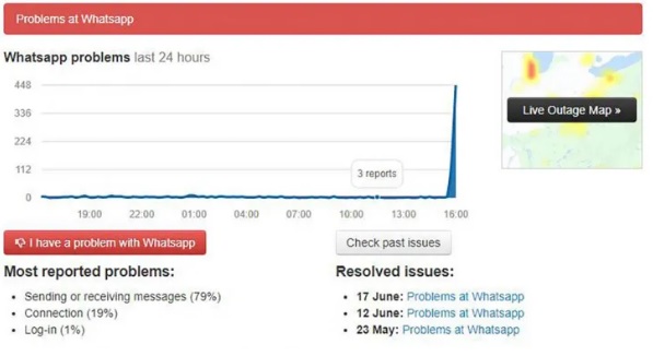 De hecho, no se pueden enviar audios, imágenes o vídeos. El problema no es solo a nivel nacional, sino que la caída de parte de los servicios ha afectado a los usuarios del resto del mundo. Un indicador de estos problemas es la web Downdetector, donde se puedes comprobar una gráfica con los reportes y quejas que han empezado a generarse a partir de las 16:00 horas.