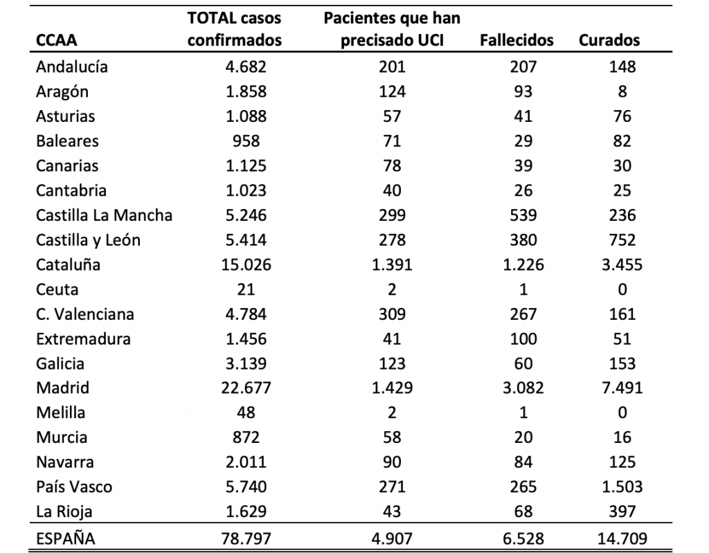 España ha registrado 838 muertes por coronavirus en las últimas 24 horas. El dato supone un leve aumento en el número de fallecidos respecto a los 832 de ayer. Con los números conocidos hoy, el país acumula 78.707 casos de coronavirus. De ellos, más de la mitad, 43.397, han necesitado hospitalización, de los que 4907 han sido ingresados en la UCI.