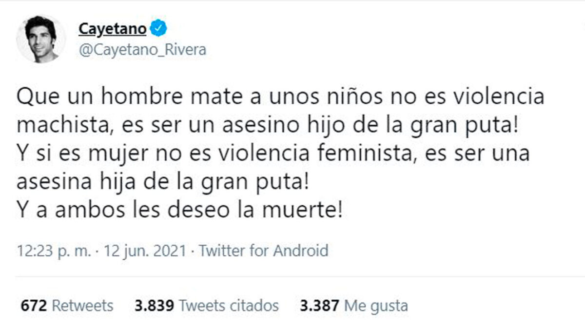 Ahora, tras los desagradables eventos sucedidos con las niñas de Tenerife, Cayetano Rivera ha aprovechado su influencia para alzar la voz y negar la violencia machista. En una red social tan conocida como es Twitter, no solo se jacta de desear la muerte de dos personas, sino de hacer juicio sobre lo que es o no es la violencia de género.