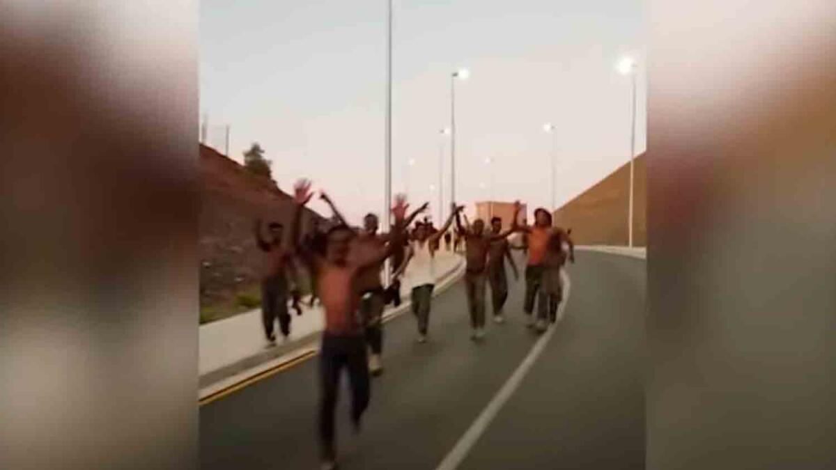 Los migrantes han llegado por su propio pie al Centro de Estancia Temporal de Inmigrantes. Lo han hecho a la carrera, atravesando algunos barrios de la ciudad y entre gritos de alegría. «Boza» o «Asilo» eran algunas de las expresiones de júbilo que podían oírse.