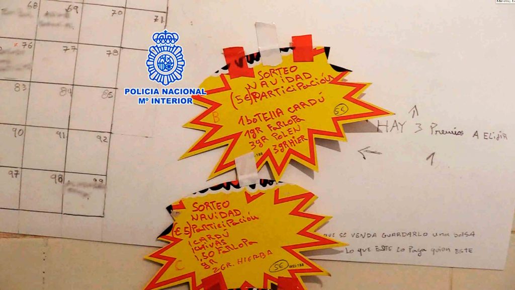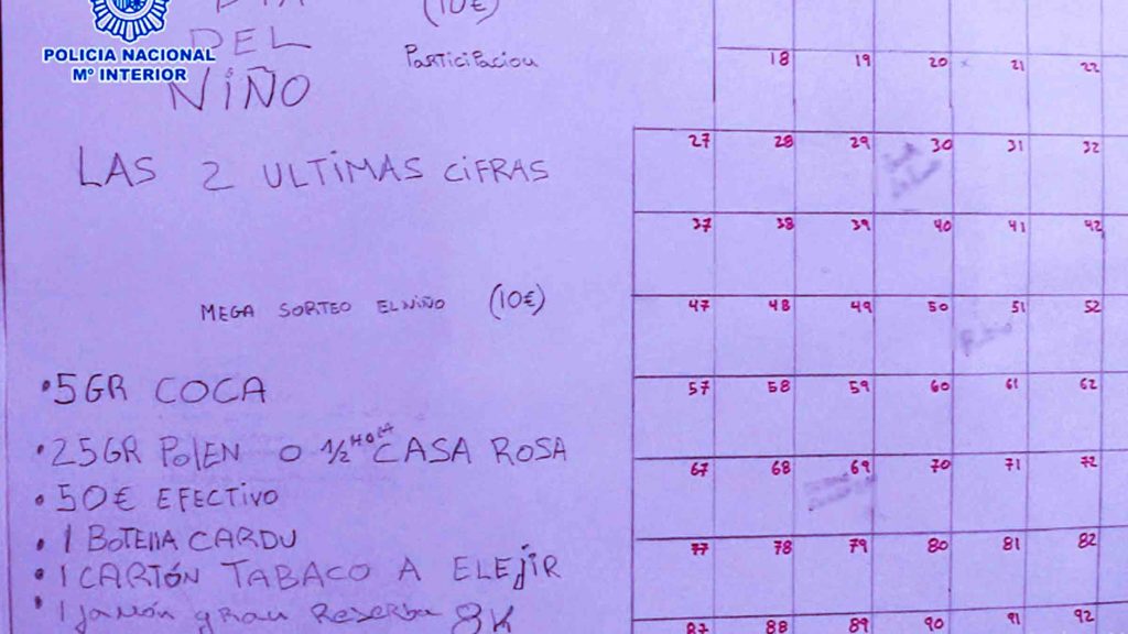 Agentes de la Policía Nacional han desmantelado en Murcia un punto de venta de droga en el que, además de abastecer a sus clientes con todo tipo de sustancias estupefacientes, se les permitía el consumo en su interior. En uno de los registros practicados, los policías localizaron una plantilla en la pared donde los clientes se apuntaban y participaban para ganar una ‘narcocesta’ en el caso de acertar las dos últimas cifras de los sorteos de Navidad o de El Niño. El premio incluía cocaína, hachís, alcohol, dinero en efectivo y hasta un jamón.
