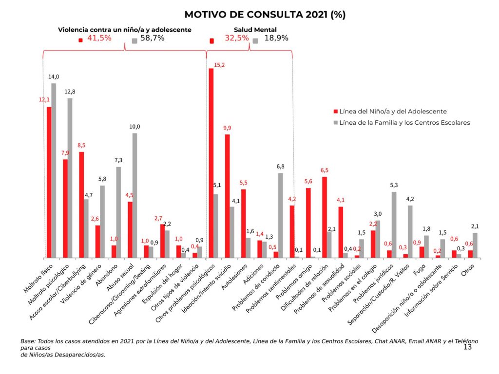 La Asociación ANAR, que ayuda a niños y adolescentes en riesgo, «trató en 2021 a 4542 menores de edad por ideación suicida, autolesiones o intento de suicidio». Los datos se extraen del Informe Anual Teléfono/Chat ANAR, basado en las llamadas telefónicas que realizaron en 2021 niños y adolescentes. Castilla y León y la Comunidad de Madrid respectivamente, son las dos autonomías que realizaron mayor número de peticiones.