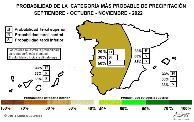 Con respecto a las precipitaciones, la AEMET ha indicado en sus predicciones que el centro y oeste peninsular tendrá un otoño con menos precipitaciones de lo habitual. Aunque no hay una tendencia clara para el tercio oriental peninsular ni para Baleares y Canarias. «En general podemos hablar de un otoño que probablemente sea más cálido de lo habitual y más seco en el centro y oeste, sobre todo», ha aclarado.