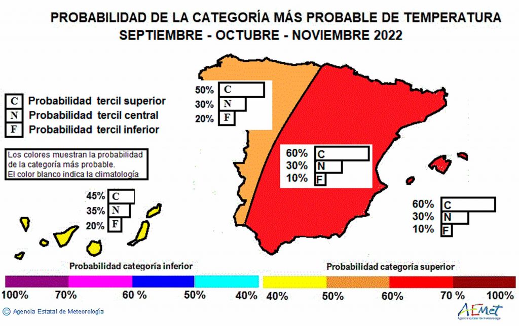 Con respecto a lo que depara al periodo meteorológico de otoño, que comienza este jueves, Rubén del Campo, portavoz de la AEMET, declara que «Hay probabilidades del 50% al 60% de que el otoño sea más cálido de lo normal en la Península y Baleares frente a solo un 10% a 20% de probabilidades de que sea más frío».
