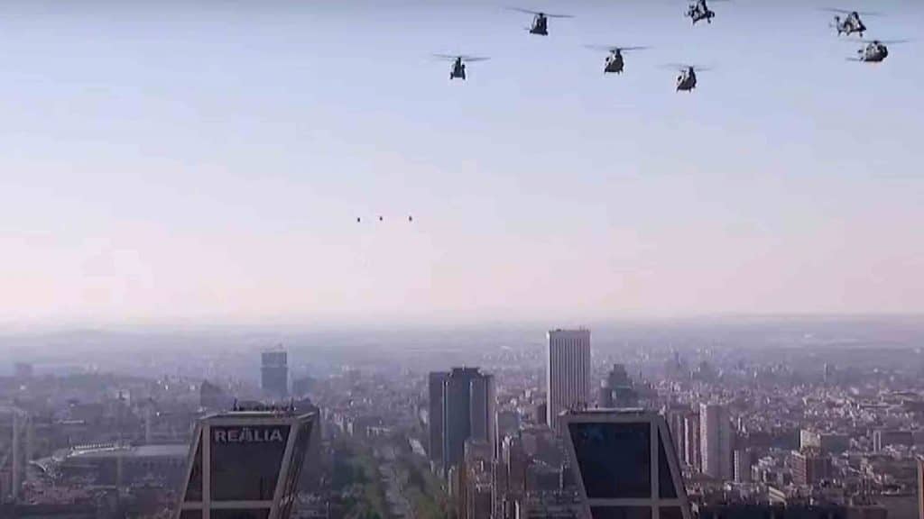 Pasadas las 11:00 horas, Sánchez llegaba al cortejo oficial y era recibido por el público entre gritos, pitidos y abucheos, y a las 11:06 arrancaba el himno oficial con los Reyes y el presidente del Gobierno ya juntos. Tras los saludos a las autoridades presentes, los paracaidistas de la patrulla acrobática han saltado con la bandera de España.