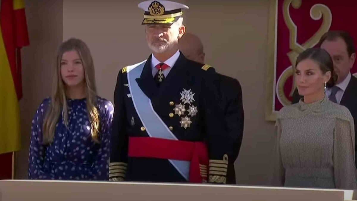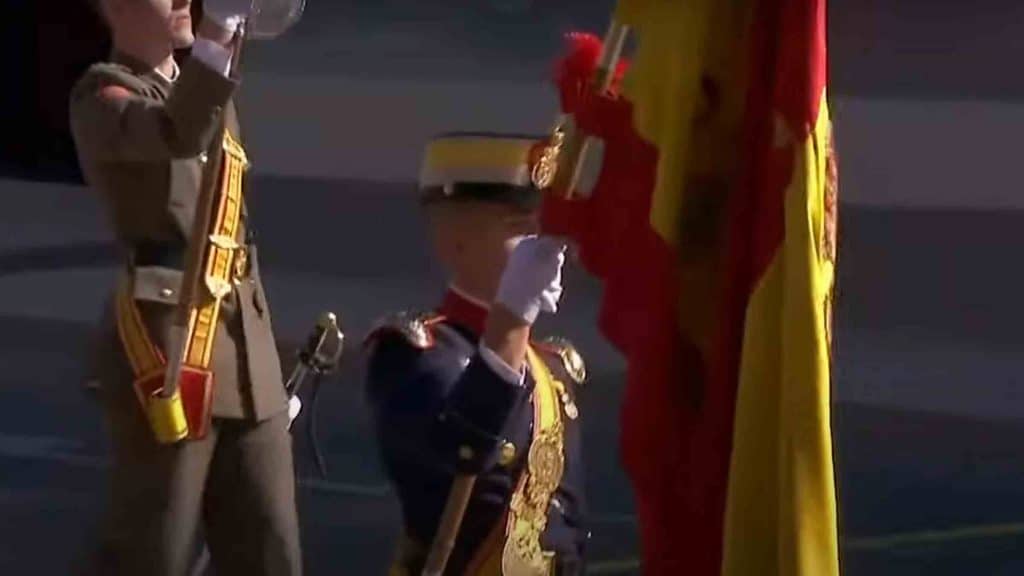 A las 10:37, casi 20 minutos antes del comienzo del desfile del Día de la Hispanidad, empezaba a sonar en Madrid el himno nacional. A las 11:00 en punto comenzaba el acto oficial, con la llegada de los Reyes y el izado de la bandera de España. A su llegada, acompañados de la infanta Sofía, han tenido que esperar en el interior del vehículo oficial unos minutos debido al retraso del presidente del Gobierno, Pedro Sánchez.