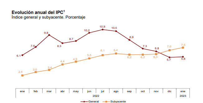 En sentido contrario, destaca la bajada de los precios de la electricidad, mayor que en enero de 2022. Por su parte, la tasa de variación anual estimada de la inflación subyacente (índice general sin alimentos no elaborados ni productos energéticos) aumenta cinco décimas, hasta el 7,5%.