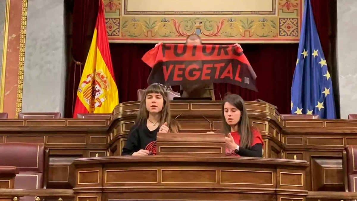 Este lunes, tres activistas de la organización Futuro Vegetal han entrado en el Congreso de los Diputados y dos han pegado sus manos a los micrófonos del estrado mientras que el tercero colgaba una bandera de la organización. La bandera, que llevaba inscrito el lema del grupo activista, ha sido retirada rápidamente por un empleado del Congreso que se encontraba en la sala.
