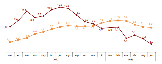 En el mismo mes de junio, pero en 2022, el IPC se colocó en el 5,5%, con precios muy superiores a los que han aparecido en el mercado en fechas recientes. Se trata de un descenso del 3,6%. Para llegar a comprender hasta qué punto se trata de una mejoría en este aspecto, cabe subrayar que es una disminución que supera la totalidad del porcentaje del mes de marzo de 2023.