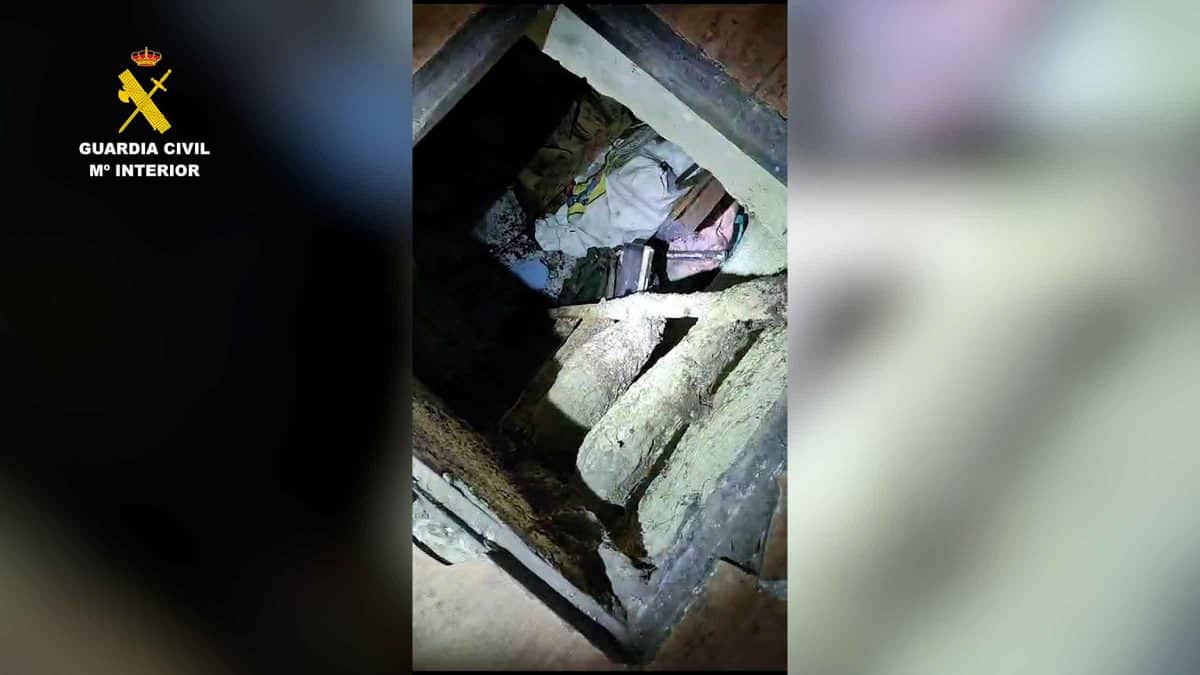 En el registro se ha localizado -en el suelo de una de las habitaciones- un acceso a un pequeño habitáculo soterrado con escaleras que coincide con la descripción facilitada por la víctima. Los agentes encontraron numerosas bridas, armas blancas y una escopeta de aire comprimido. Era un entorno totalmente insalubre, con mucha suciedad acumulada y abarrotada de objetos y basura.